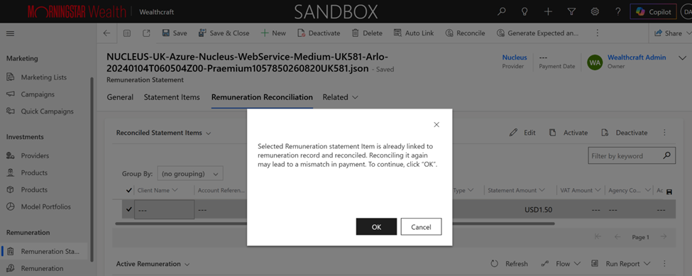 To reduce the risk of duplicate reconciliation, users will now receive a warning when attempting to reconcile additional remuneration against a statement item that has already been reconciled.