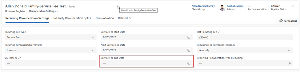 A new Service Fee End Date field is now available in recurring remuneration settings within the Business Register. This prevents remuneration expectations from being generated beyond the specified end date.